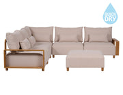 Featuring a solid wooden frame with clean lines and generously padded cushions, this set offers both durability and a relaxed, luxurious feel. The natural wood tones paired with soft, neutral cushions create a warm and sophisticated atmosphere — perfect for terraces, patios, or garden lounges.