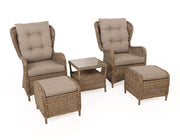The set is crafted from durable dusty polyrattan weave and includes luxurious sand-colored cushions for an elegant touch. These materials are both durable and weather-resistant, making this set an ideal choice for your patio or garden.