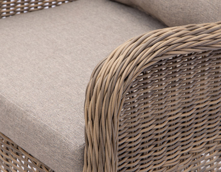 Made from durable dusty-tone polyrattan with soft, sand-colored luxury cushions that offer both support and style.