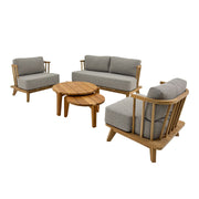 The weather-resistant cushions in a neutral tone perfectly complement the natural wood, creating a balanced mix of style and functionality. Its ergonomic design and clean lines bring a modern yet inviting touch, while the nesting teak tables add versatility and practicality to the set.