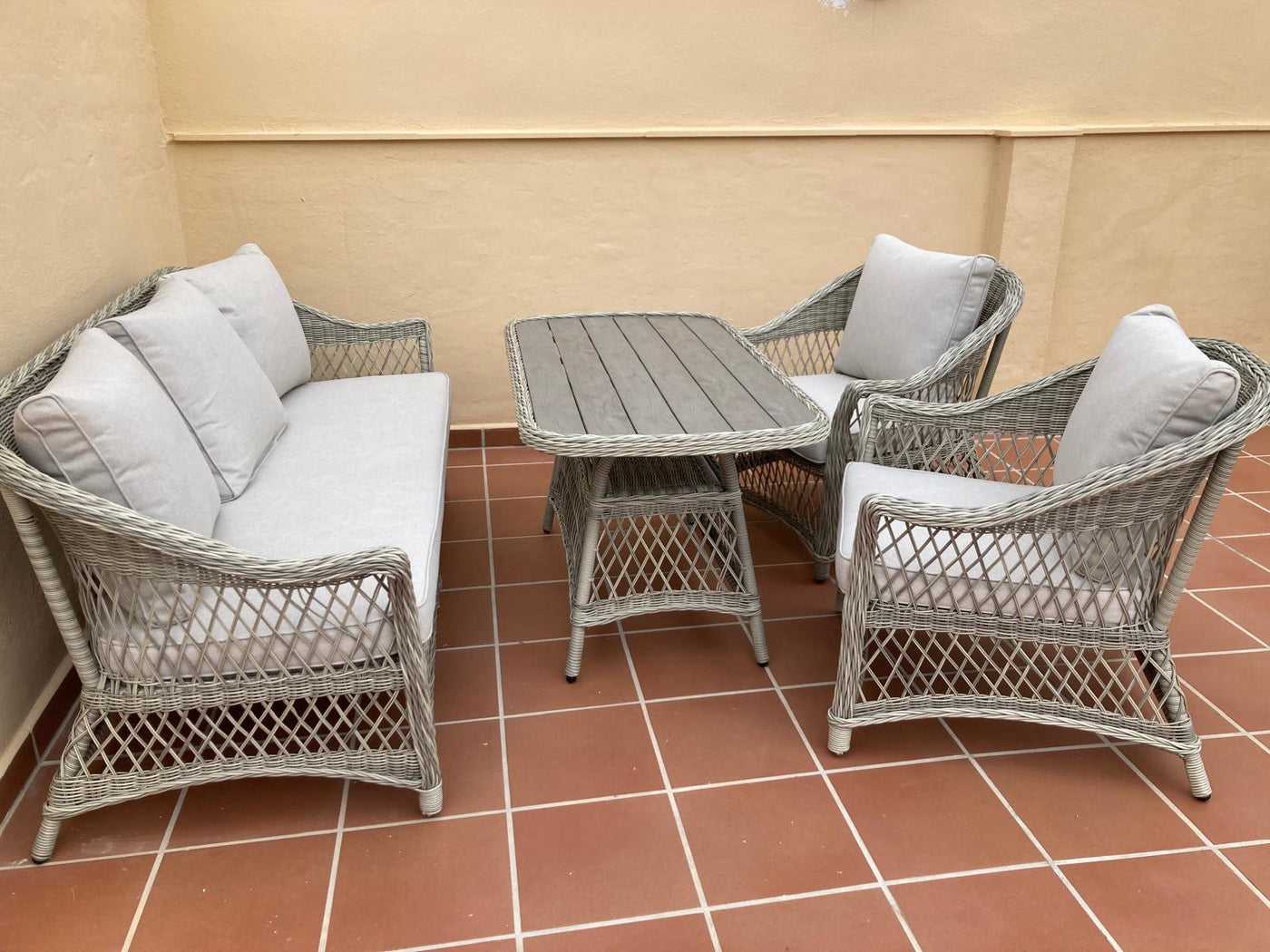 Outdoor Sofa Set with Light Grey Wicker and Slatted Table Introducing a stylish and modern sofa set designed for both...