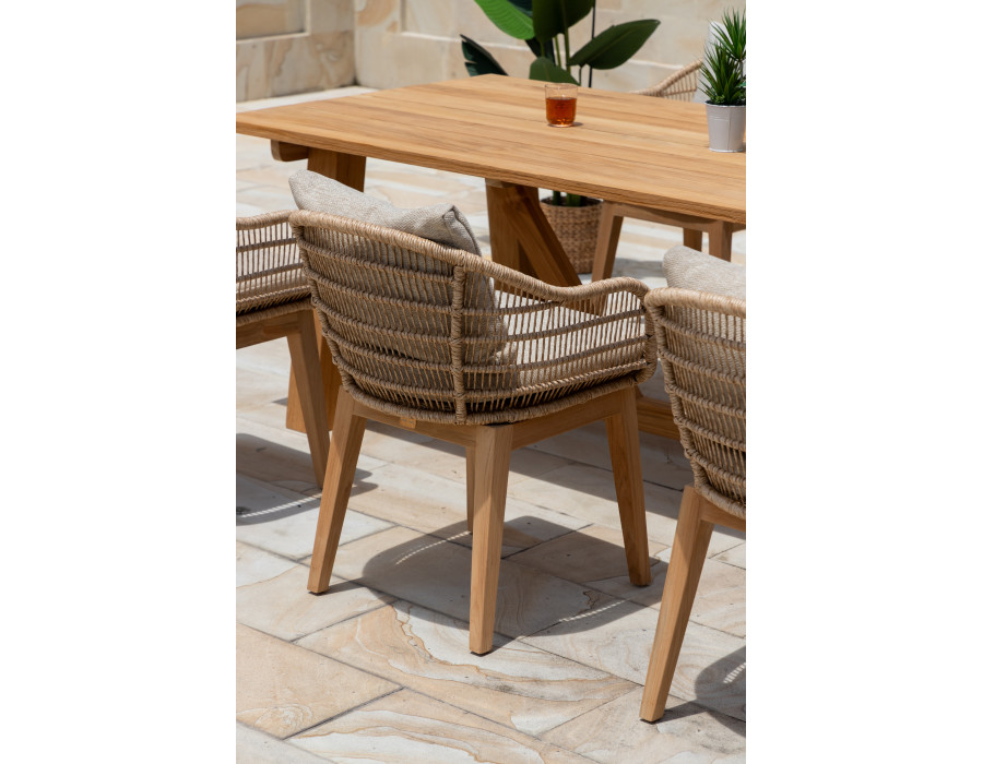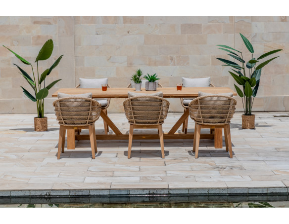 This is a beautifully crafted teak plank table, featuring four meticulously joined planks. Made from high-quality solid core teak wood, this table showcases the finest craftsmanship and durability. The natural grain of the teak wood adds warmth and elegance to any space, making it a versatile piece suitable for both indoor and outdoor use.