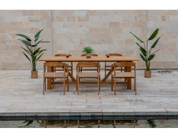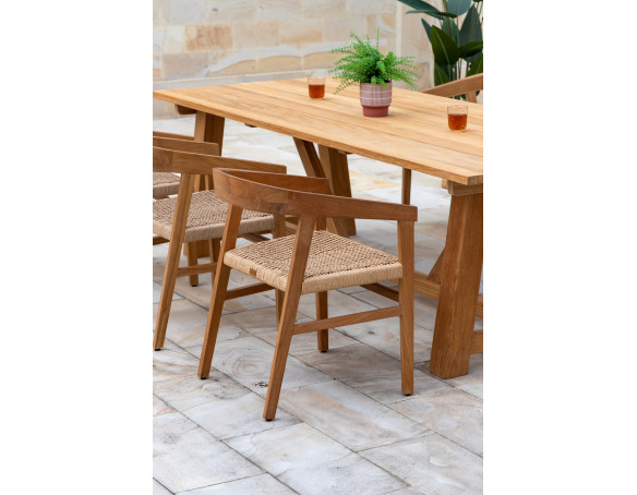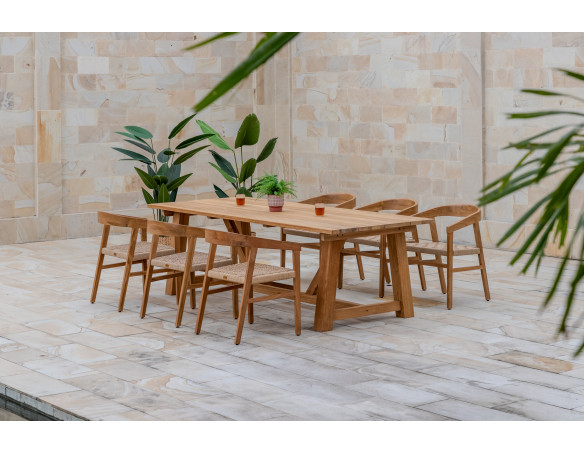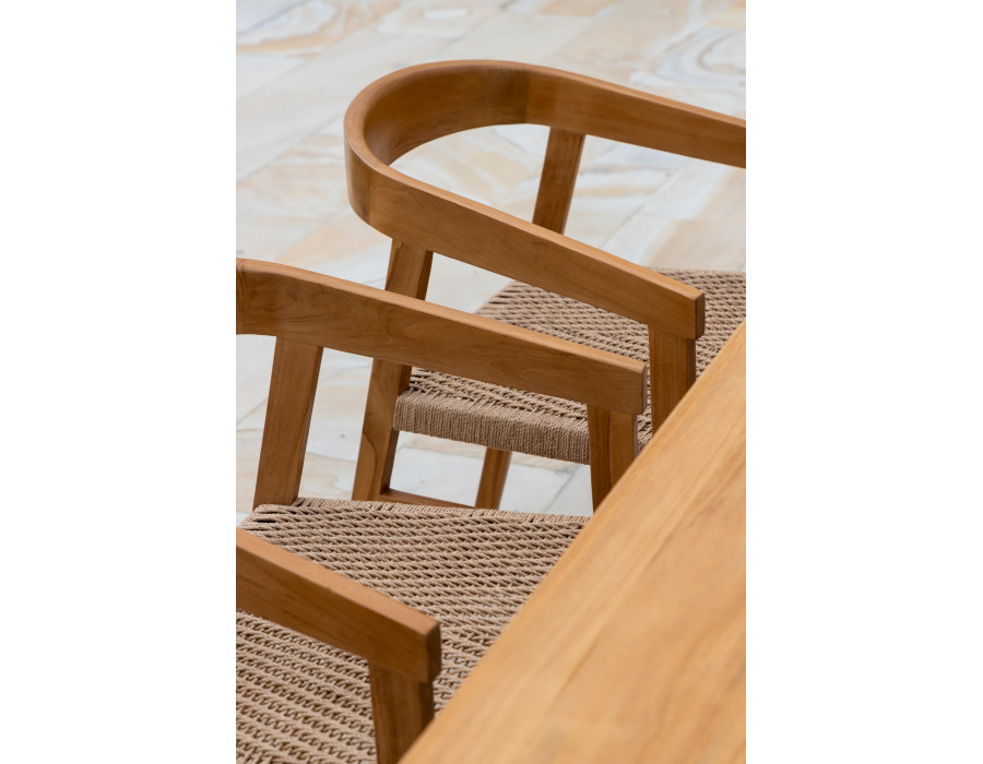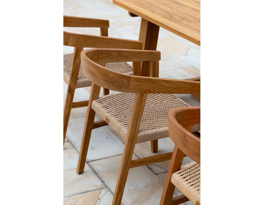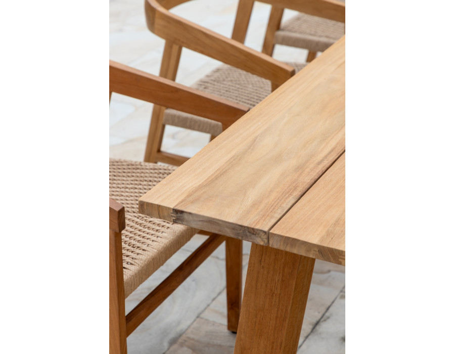 Its natural teak finish and simple lines make it ideal for terraces, patios, and outdoor dining areas.