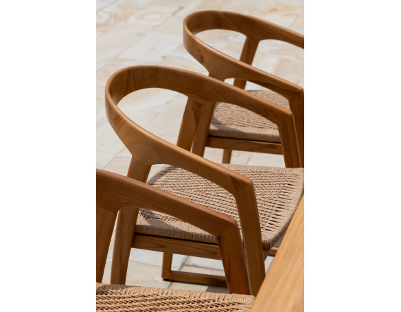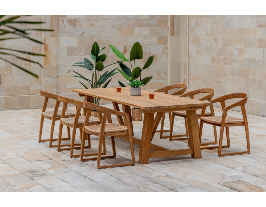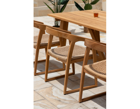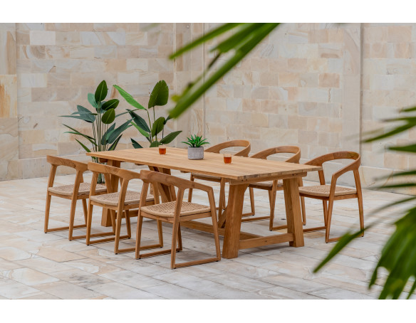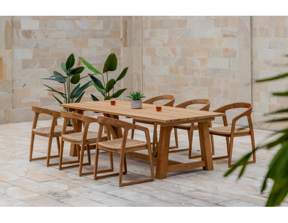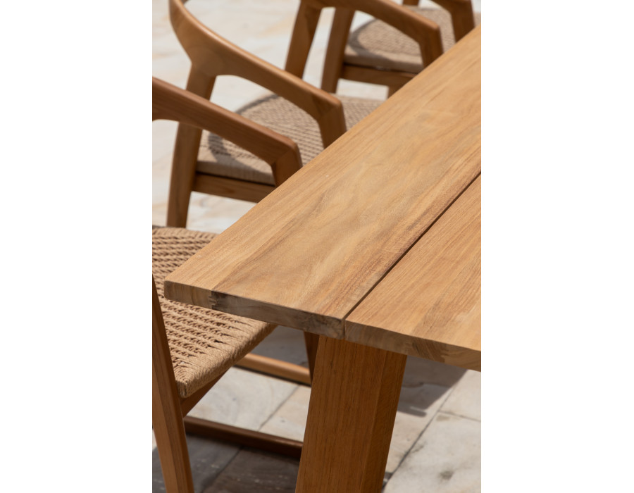 This is a beautifully crafted teak plank table, featuring four meticulously joined planks. Made from high-quality solid core teak wood, this table showcases the finest craftsmanship and durability. The natural grain of the teak wood adds warmth and elegance to any space, making it a versatile piece suitable for both indoor and outdoor use.