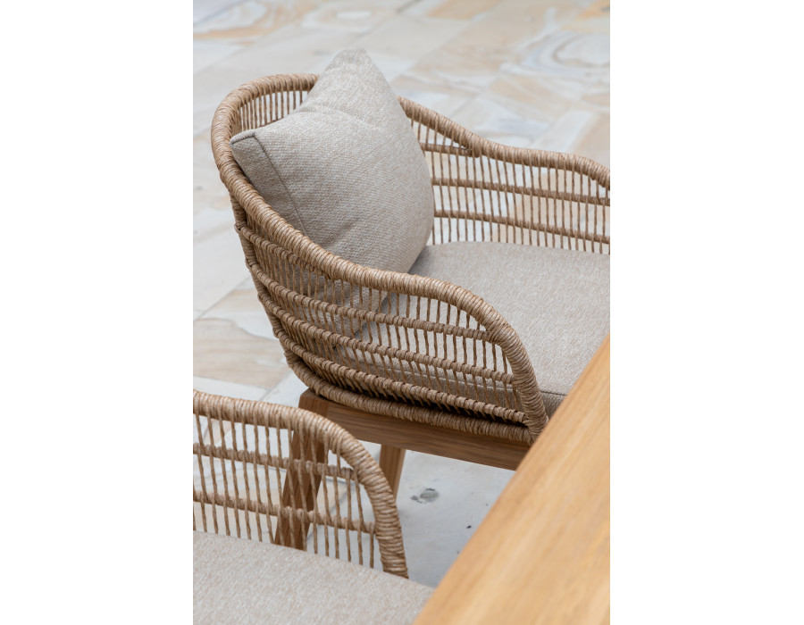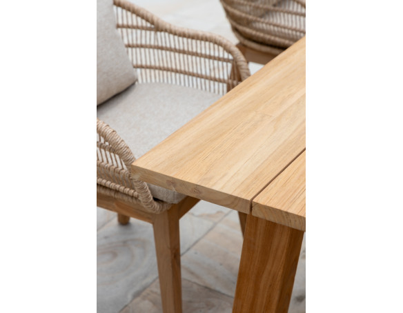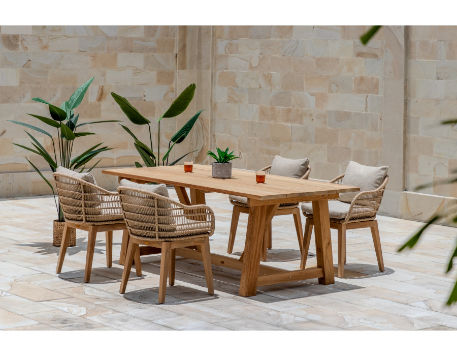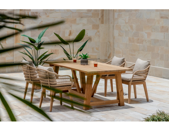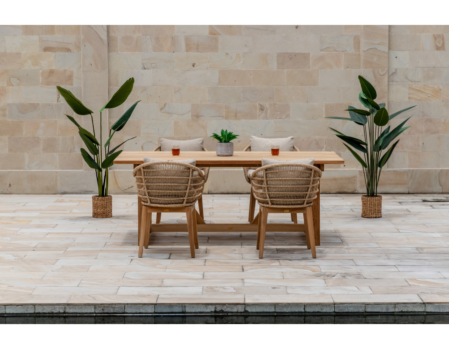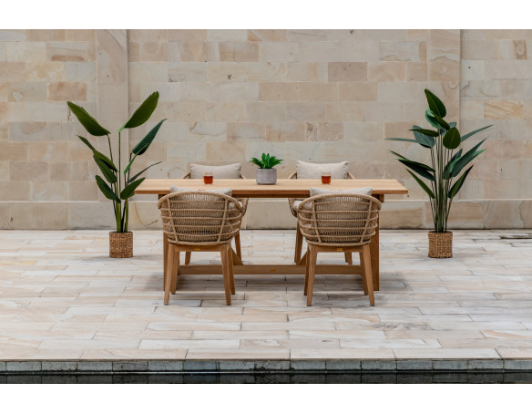 This stunning table is crafted from solid core teak wood, featuring four high-quality planks. Designed for both outdoor and indoor use, it combines durability with elegance.