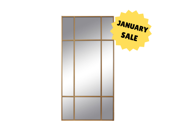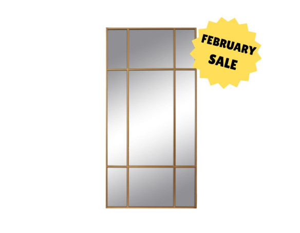 Large mirror with a slim gold iron frame. Can be wall-mounted vertically or horizontally, or placed on the floor for flexible styling options.