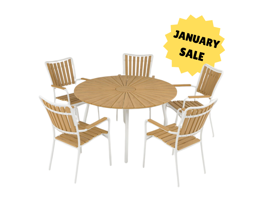 Elevate your outdoor space with the stylish and maintenance-free DaneLine Garden Furniture Set, featuring a round table and five stackable armchairs in Mode White aluminum with ergonomic Artwood details.