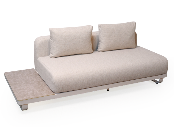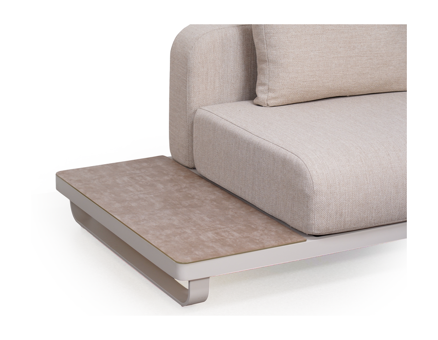 The sofa includes a built-in side table that can be placed on either side, providing practical space for a coffee cup or a book. The matching coffee table completes the set beautifully.